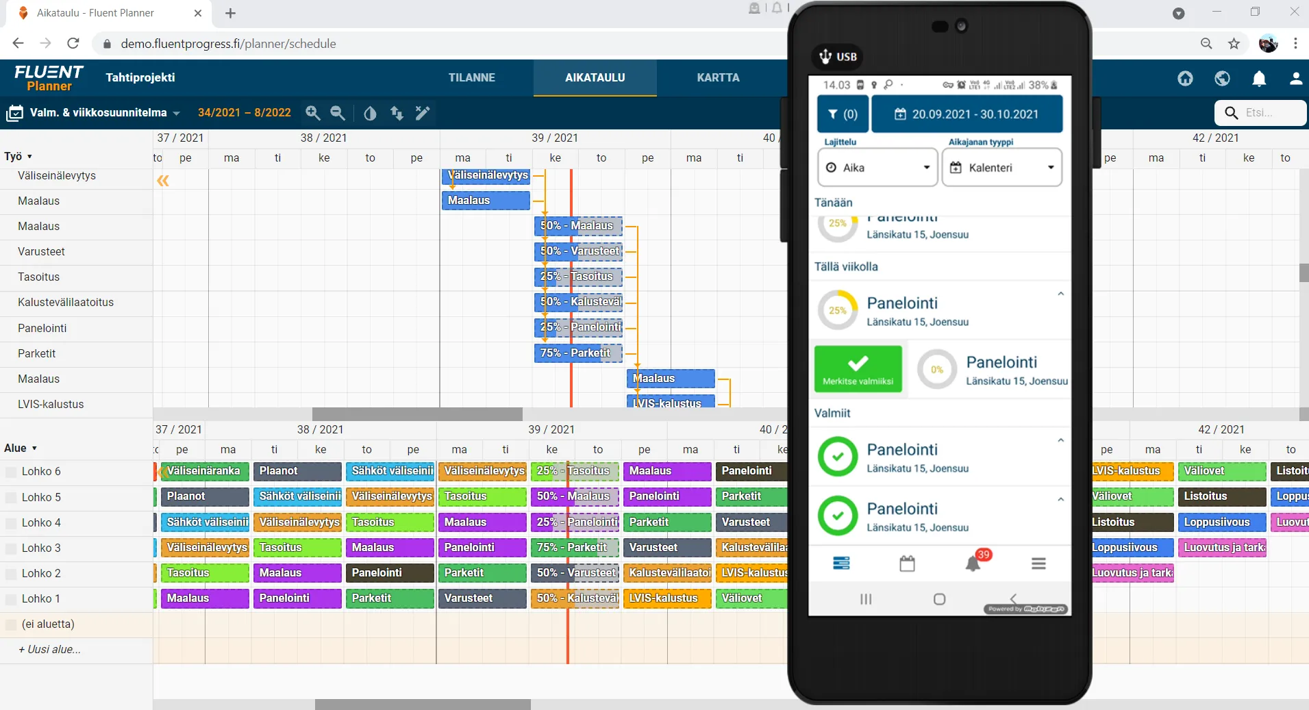 Fluent Plannerin mobiilisovelluksen listanäkymä kertoo jokaiselle seuraavan tahdin tehtävät ja työalueet ja töiden kuittaaminen aloitetuksi ja lopetetuksi valokuvin ja kommentein on nopeaa ja helppoa.
